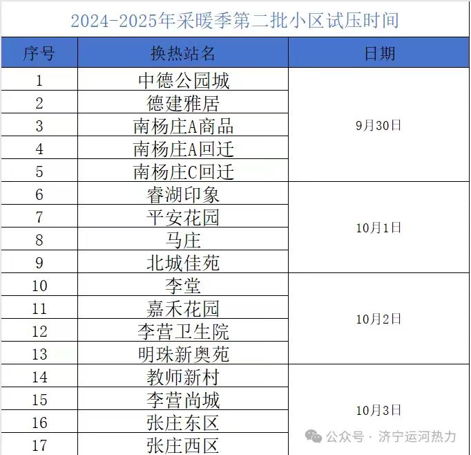 2024-2025年度供暖試壓工作已按計劃順利開展,現(xiàn)將第二批小區(qū)的注水試壓時間公布,具體情況詳見下表。工作人員將提前一周在各小區(qū)單元樓通知欄張貼試壓通知,請注意查看。試壓期間家中務(wù)必留人,若出現(xiàn)漏水請及時關(guān)閥處理,避免造成家中財物損失。